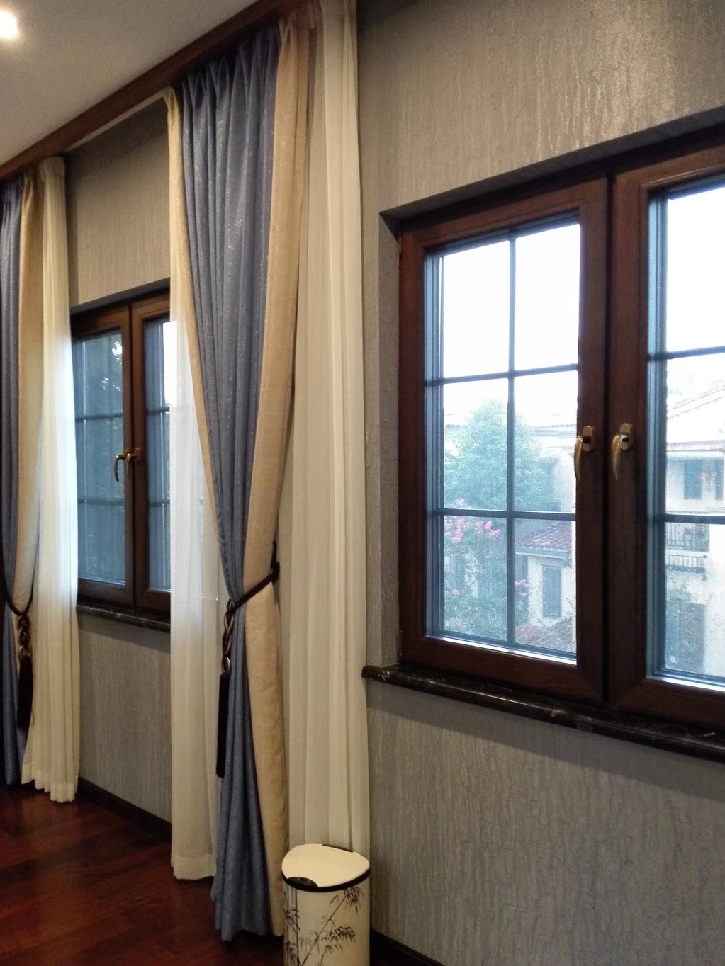 金堂木鋁包木門窗隔音效果好所有的鋁包木門窗安裝完畢,做工真的不錯,橡木的材料很結(jié)實厚實,紋理好。